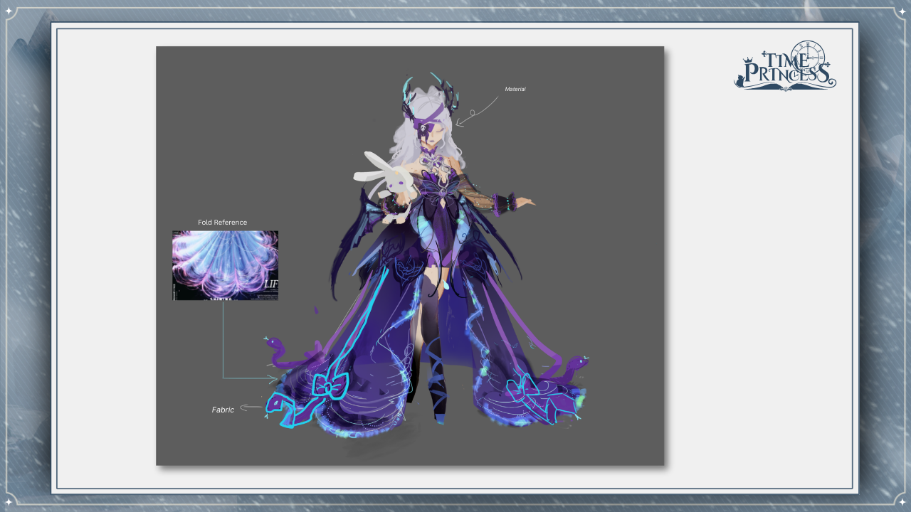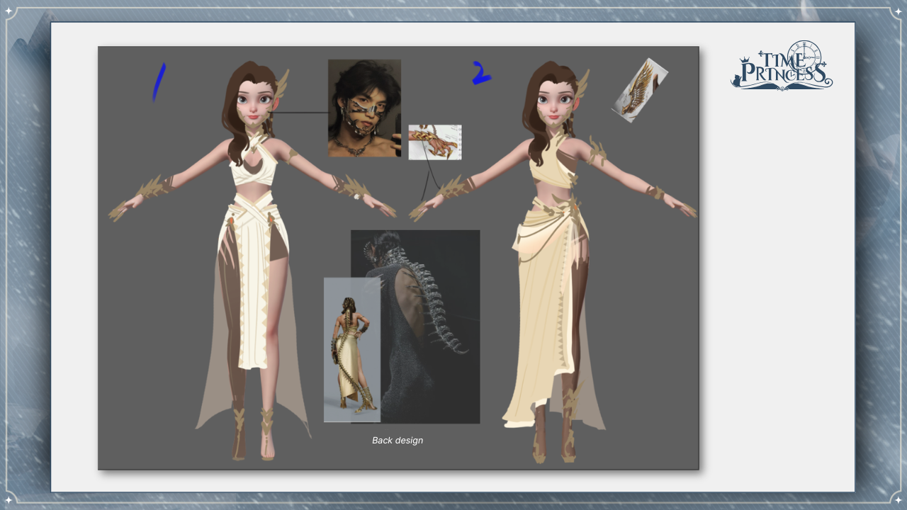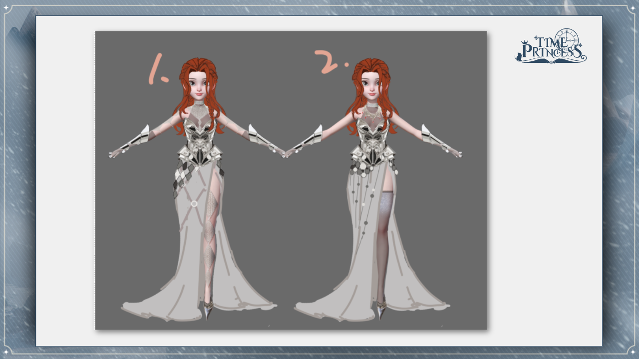 First off, we have Glory of Valhalla! This is one of the first outfits you’ll receive in the story. We explored two variations for this design: a double-slit skirt and a single-slit skirt, paired with a long spine necklace. While we wanted to incorporate some sharp elements, we ultimately decided on a more balanced look. Which of the two would you have chosen? 💅