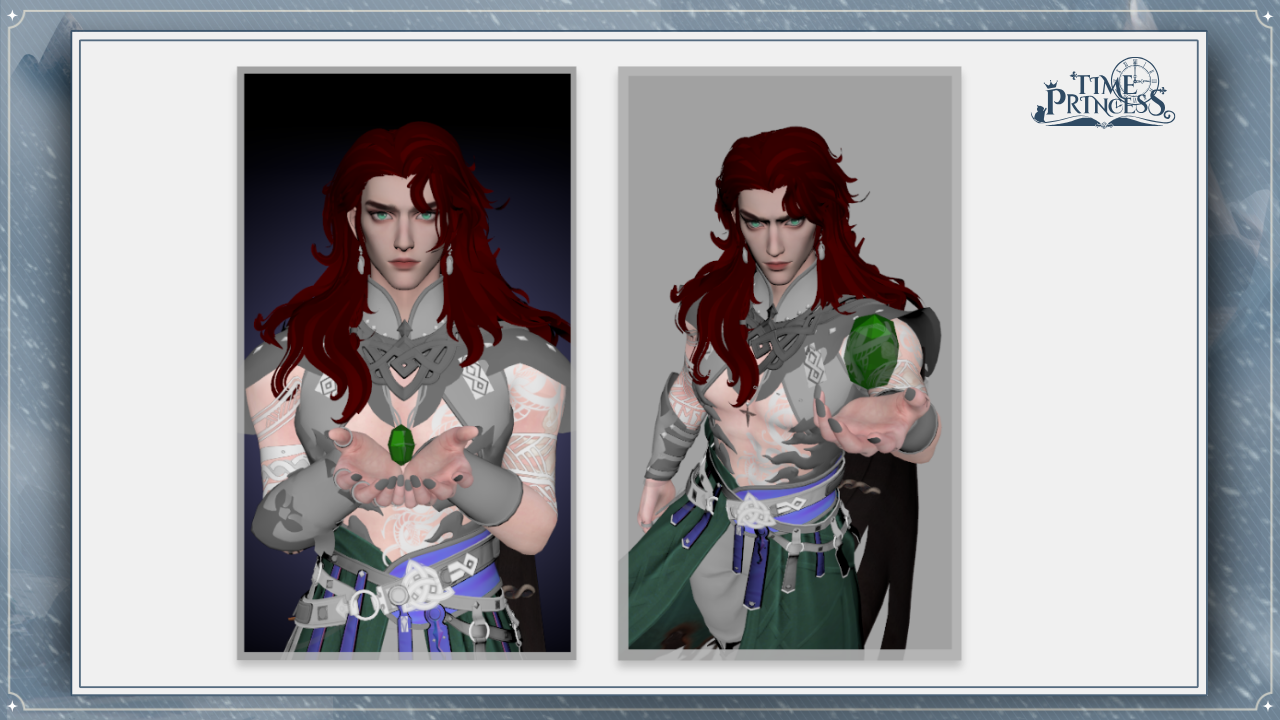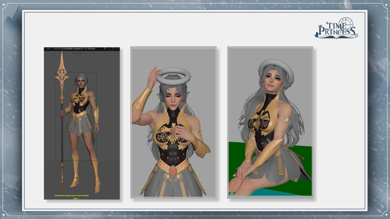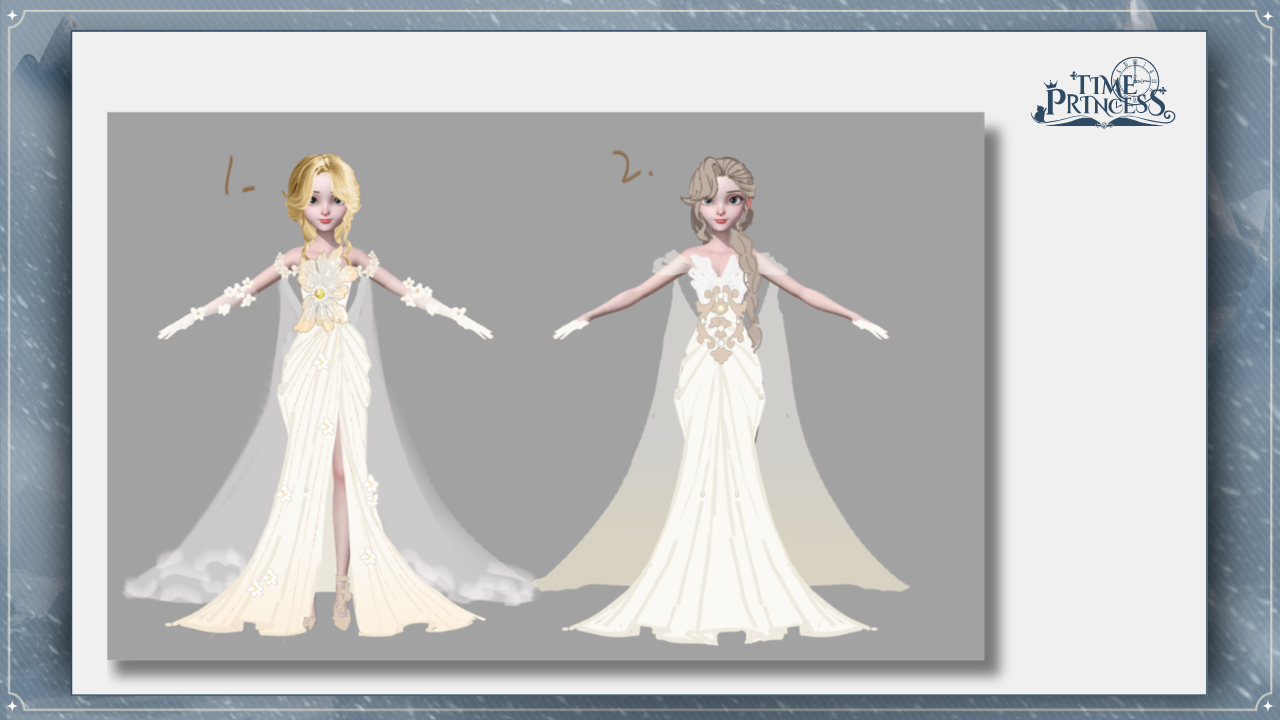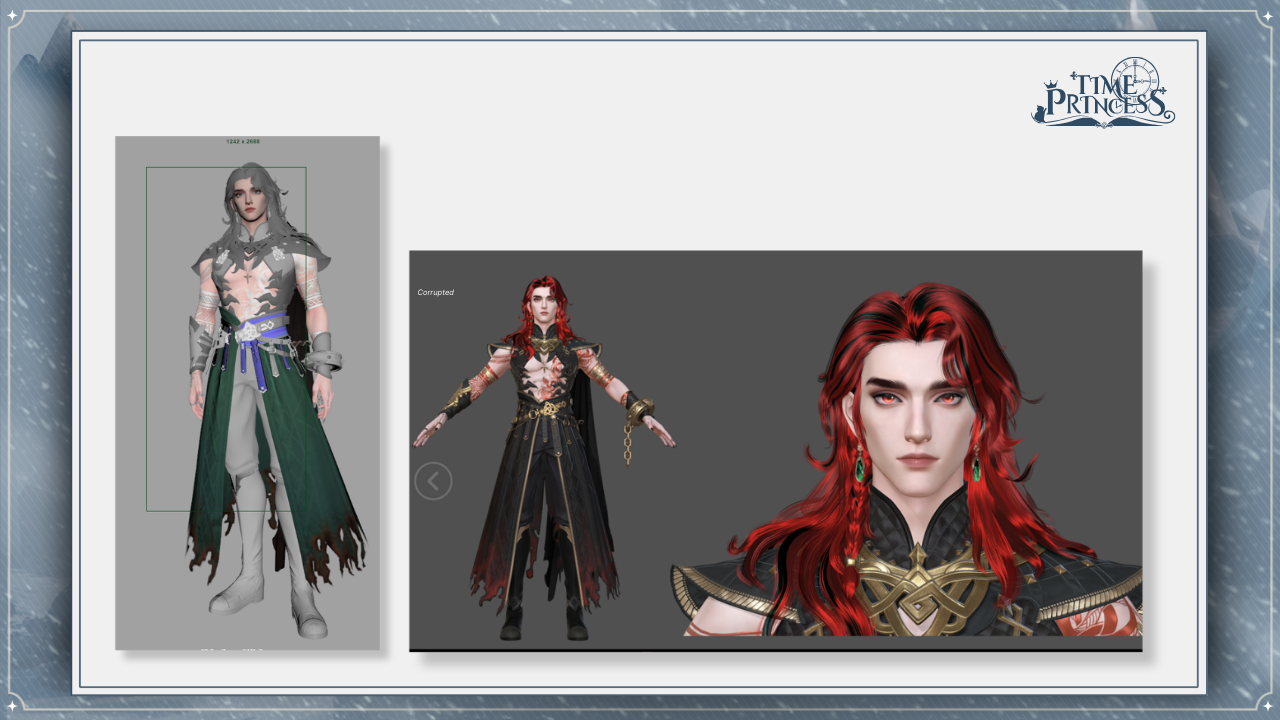 First off, we have Glory of Valhalla! This is one of the first outfits you’ll receive in the story. We explored two variations for this design: a double-slit skirt and a single-slit skirt, paired with a long spine necklace. While we wanted to incorporate some sharp elements, we ultimately decided on a more balanced look. Which of the two would you have chosen? 💅
