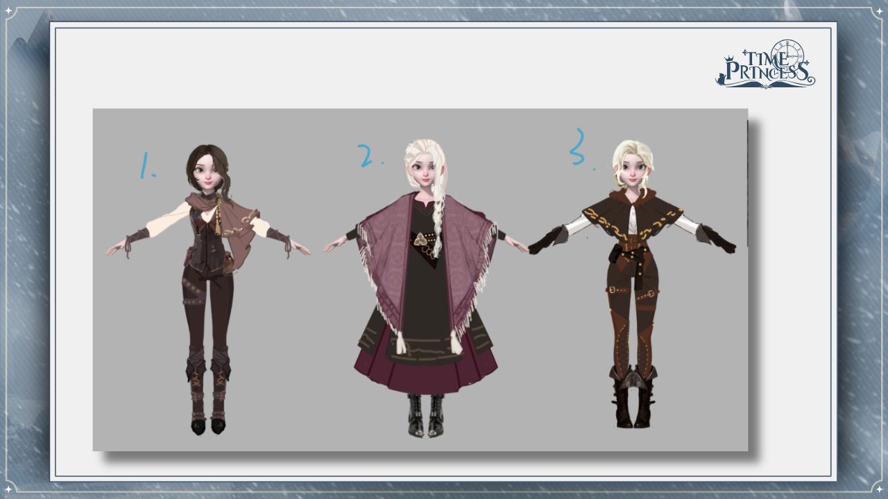 Thirdly, this is Faint Light of Midwinter. We explored a few different directions for this outfit, from a more layered traveler look to a shawl-inspired silhouette. In the end, we settled on the third design, which we felt captured the Kaiya’s adventurous spirit! Would you choose 1, 2 or 3? ⛰️