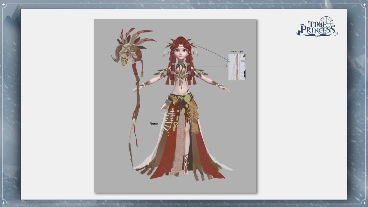 Now, this is our Lucky Jerry outfit, Song of Hyndla! This outfit draws inspiration from the völvas of Norse mythology, seers who practiced magic and foretold the coming calamities. The bones, feathers, and hemp rope give the outfit a shaman-like look, reflecting her connection to spirits and ancient prophecy. How do you feel about this design? 🤔