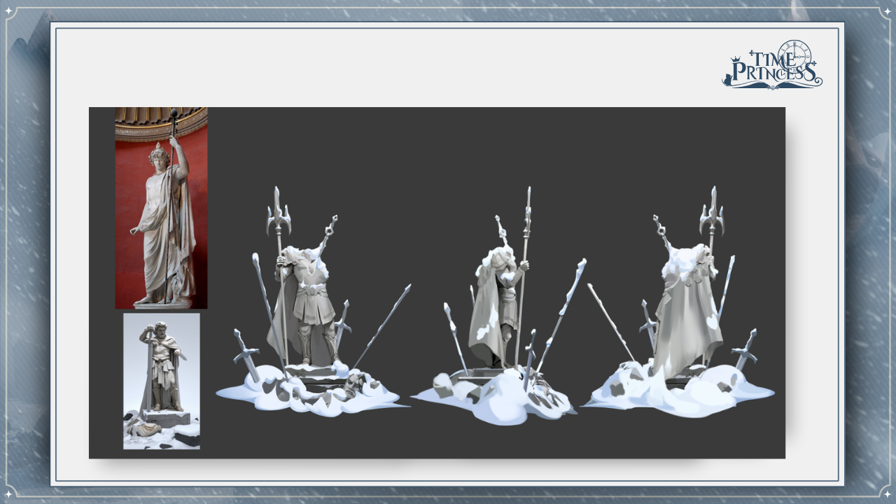 We drew inspiration from the Statue of Antinous and classical statues in general. Through this design, we wanted to highlight the grandeur of Coming Calamities and the idea that destruction can pave the way for rebirth. We hope this statue symbolizes the journey and the chaos that comes with it. What are your thoughts on this statue? 🤔