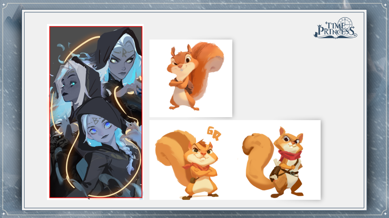 As for the side characters, here are the drafts for the Norns and Ratatoskr, the weavers of fate and our squirrel messenger! Do you have a favorite side character? 🧐